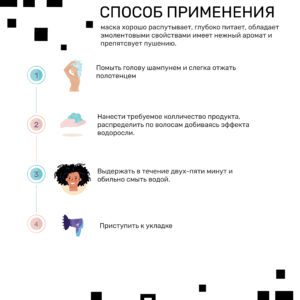 Нанесите маску на чистые, слегка влажные волосы, равномерно распределив по всей длине. Оставьте на 5–10 минут, затем тщательно смойте теплой водой. Для достижения максимального эффекта используйте маску 1–2 раза в неделю.