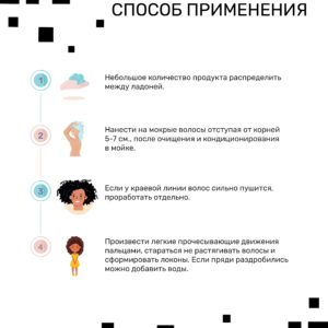 Применение: небольшое количество продукта распределить между ладоней. Нанести на мокрые волосы отступая от корней 5-7 см., после очищения и кондиционирования в мойке. Если у краевой линии волос сильно пушится, проработать отдельно. Произвести легкие прочесывающие движения пальцами, стараться не растягивать волосы и сформировать локоны. Если пряди раздробились можно добавить воды.